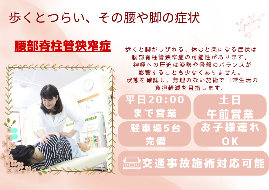 A. はい、腰部脊柱管狭窄症の代表的な症状のひとつです。歩行時に神経が圧迫され、前かがみや休憩で楽になるケースが多く見られます。当院では姿勢や骨盤・背骨のバランスを整え、神経への負担を減らす施術を行います。